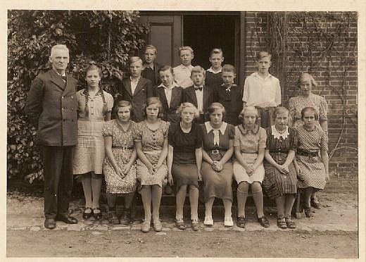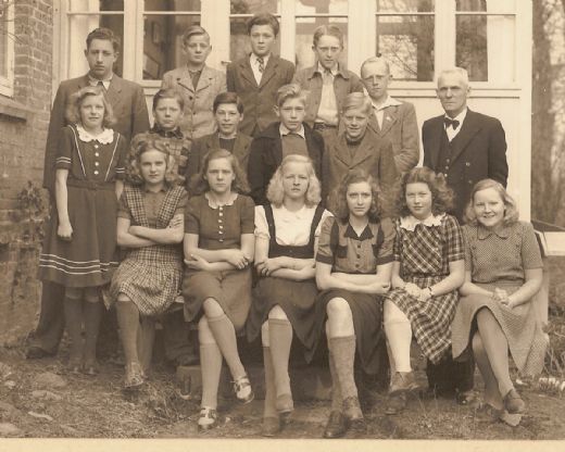 Anden række fra venstre: nr.2 Nanna Nielsen,Bundgård - Lilly Jackobsen,Brøndumbæk - Niels Nielsen,Hem - Alfred Kristensen,Hem - Johannes Mortensen,Hem - Frede Nautrup,Krarup - Ejner Christensen,Hindborg Hoskjærgård